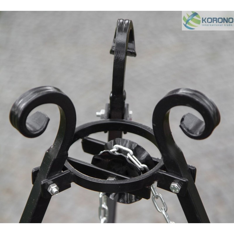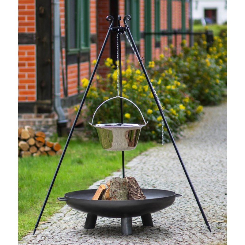 Dreibein mit höhenverstellbarem Grillrost aus Rohstahl für perfektes Grillergebnis und tolle Aromaentfaltung.