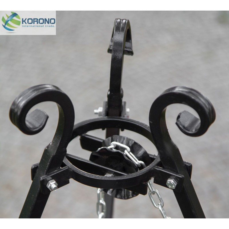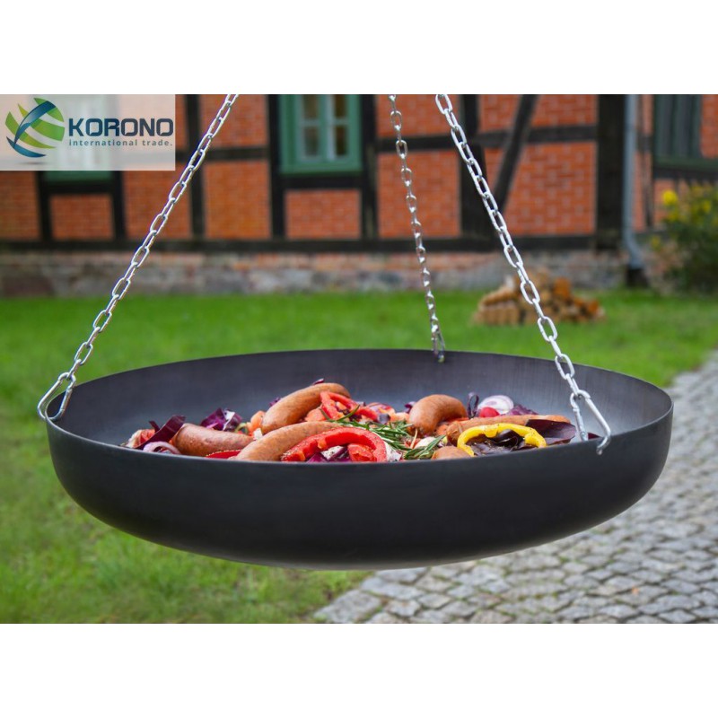 Es lohnt sich, im Garten Speisen mit Hilfe von Wok/Pfanne anstelle eines herkömmlichen Rostes zuzubereiten. Das Produkt ist aus 2 mm dickem Stahl ausgefertigt. Das Dreibein ist pulverbeschichtet, was seine Wetterbeständigkeit erhöht. Die Winde im oberen Teil des Dreibeins ermöglicht die Regulierung der Rosthöhe. Dank seiner Attraktivität wird das Produkt den Garten verschönen sowie den Standard der Hausumgebung erhöhen. Der Wok/die Pfanne ist so konzipiert, dass er/sie am Dreibein direkt über dem Feuer hängt. Das Set besteht aus folgenden Elementen: Wok/Pfanne, Dreibein mit einem Satz von verzinkten Ketten und Karabinerhaken für das Aufhängen des Gefäßes. Dank diesem Produkt werden Sie im Stande sein, Fleisch- und Gemüsegerichte aller Art, überbackenen Fisch und sogar eine große Portion Rührei zuzubereiten. Dieses Erzeugnis aus dickem Blech ist sehr tief und geräumig. Die Füße des Ständers haben spitze Enden, weshalb sich der Wok/die Pfanne auf jeder Fläche aufstellen lässt.